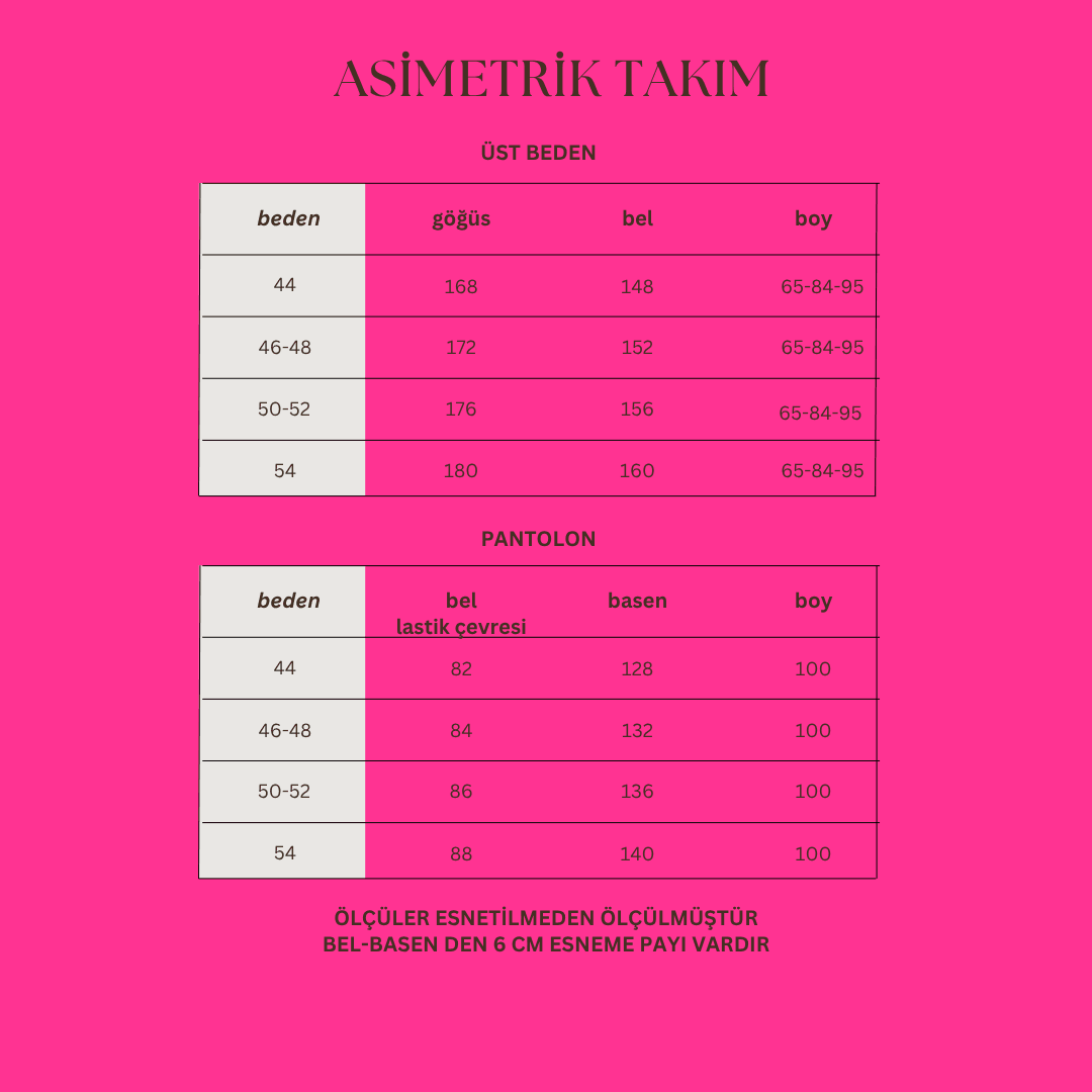 Asimetrik Büyük Beden Takım, modern tasarımı ve rahat kesimi ile dikkat çekmektedir. Uzun asimetrik kesimli tunik, geniş paça pantolon ile birleşerek, vücut hatlarını zarif bir şekilde kapatırken, konforlu bir kullanım deneyimi sunar. Bu takım, hem günlük yaşamda hem de özel etkinliklerde tercih edilebilecek çok yönlü bir seçenektir.