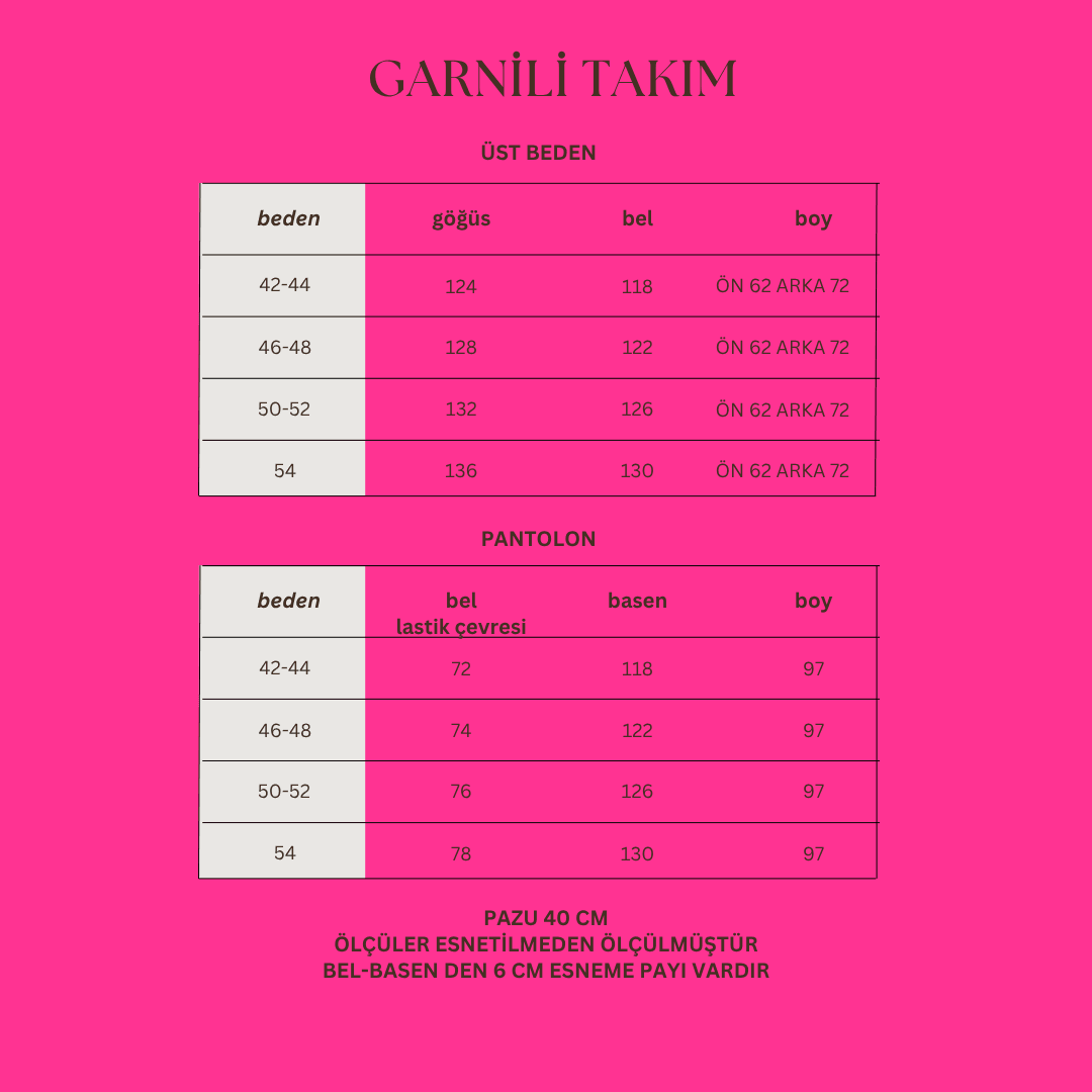 Takımın zarif garnili detayları, spor şıklığını yansıtır. Farklı renk seçenekleri ile kişisel tarzınızı yansıtmanıza olanak tanır. Hem spor salonunda hem de günlük hayatta rahatlıkla kombinlenebilir.