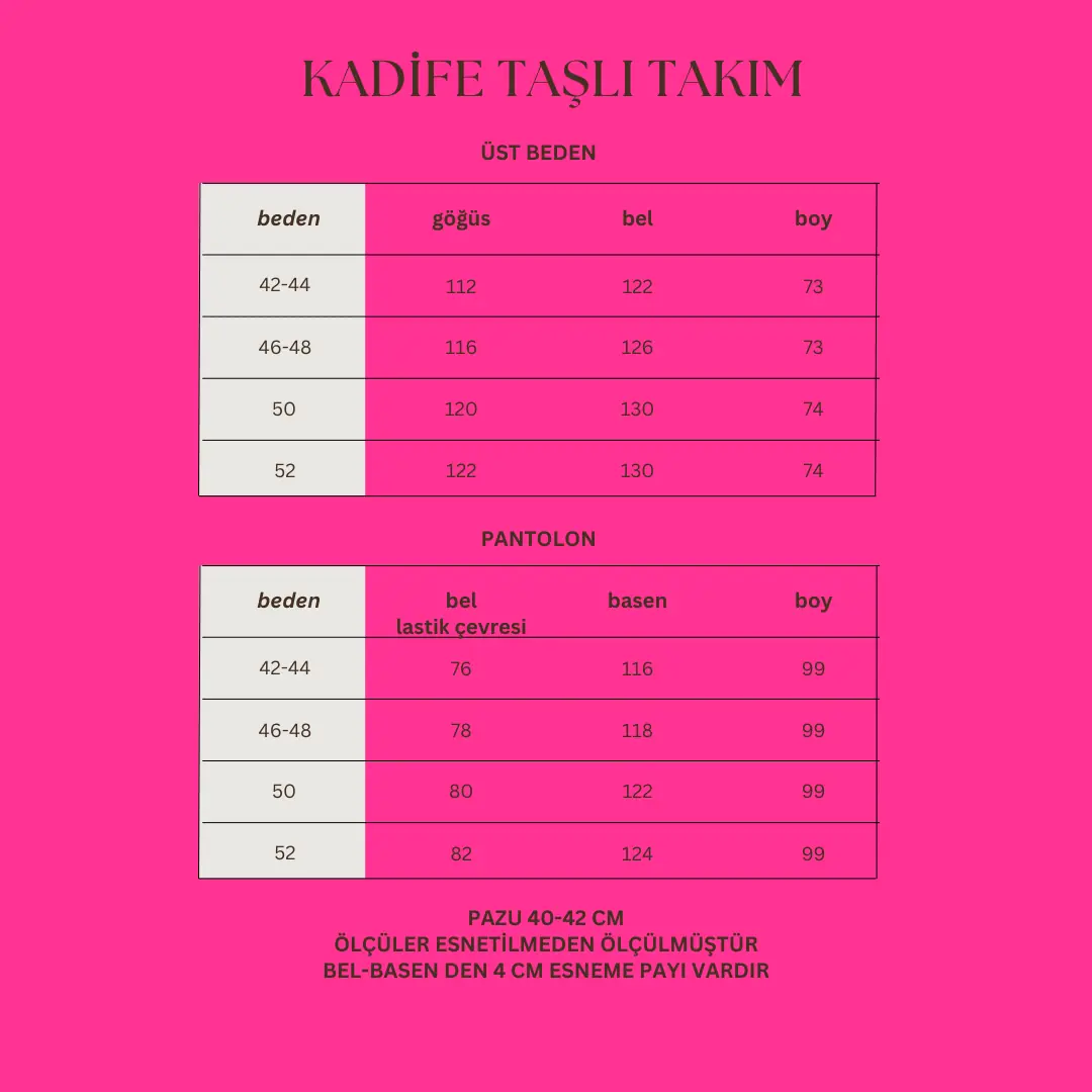 Kadife Taşlı Takım, geniş beden seçenekleri ile her vücut tipine uyum sağlar. Esnek yapısı sayesinde hareket özgürlüğü sunarken, hafif ve nefes alabilir kumaşı ile gün boyu rahatlık hissi verir. Eşofman altı ve üstü, spor aktiviteleri için ideal bir kombin oluşturur.