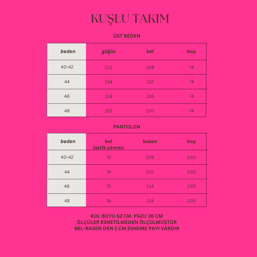 Kuş motifleri, takıma modern bir dokunuş katarken, günlük kullanımda da şıklığı ön planda tutar. Hem spor hem de günlük giyimde rahatlıkla tercih edilebilecek bu takım, farklı kombinlerle zenginleştirile Devamını Göster