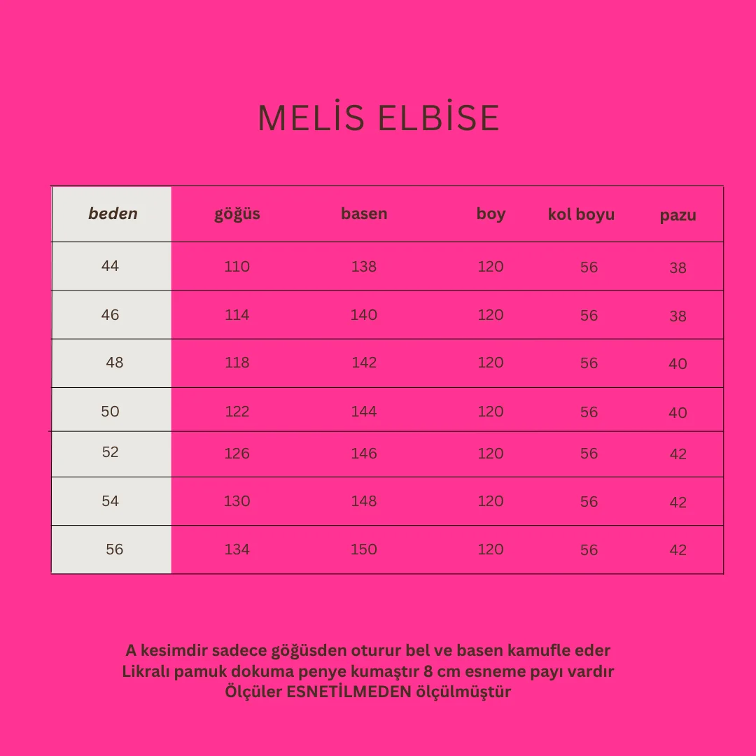 V yaka detayı, boyun çizgisini vurgularken, uzun kol tasarımı ile zarif bir görünüm sağlar. 44’ten 56’ya kadar geniş beden aralığı, farklı vücut tiplerine hitap ederek, her kadının kendini özel hissetmesine olanak tanır. Melis Elbise, hem günlük kullanım hem de özel davetler için ideal bir seçenek sunar.