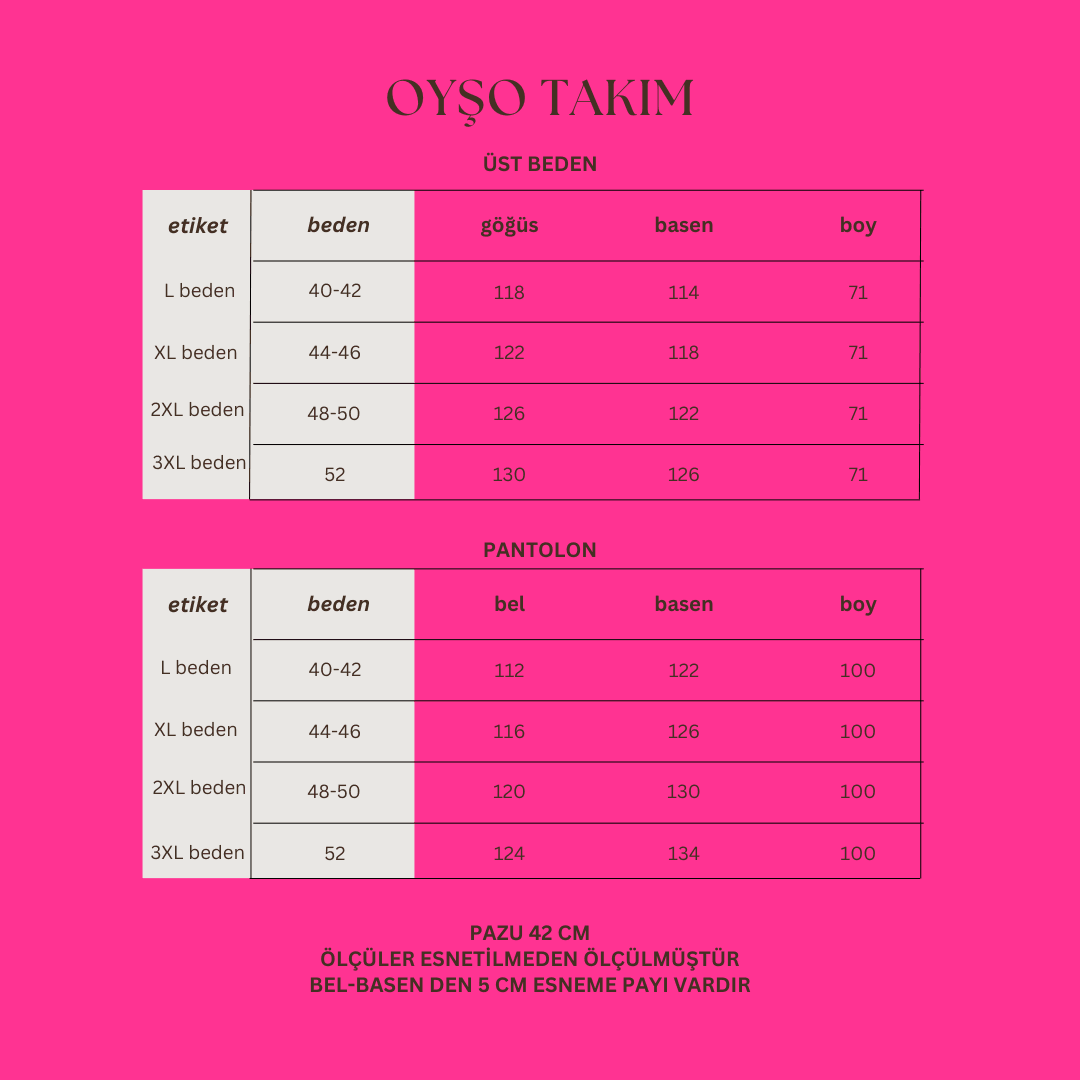 Oyso Büyük Beden V Yaka İkili Takım, sade ve şık tasarımıyla günlük yaşamda zarafeti ön plana çıkarıyor. Üst kısmındaki V yaka detayı, modern bir görünüm sunarken, geniş paça pantolon konforlu bir kullanım deneyimi sağlar. Bu takım, hem klasik hem de spor kombinlere mükemmel uyum sağlayarak, zamansız bir stil arayanlar için ideal bir seçenek oluşturur.