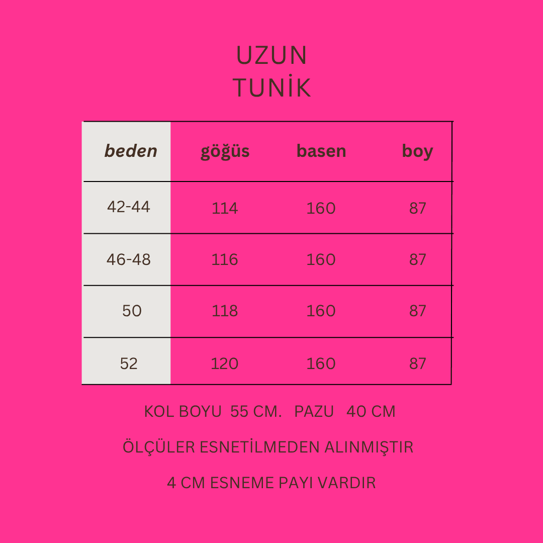Tunik tasarımı, bel ve basen bölgesini zarif bir şekilde kapatarak, her bedene uyum sağlayan bir siluet oluşturur. Modern kesimi ve şık detayları ile günlük kullanımda veya özel davetlerde tercih edilebilir. Farklı renk seçenekleri ile kombinlenebilir olması, kullanıcıların stiline göre özelleştirme imkanı sunar.