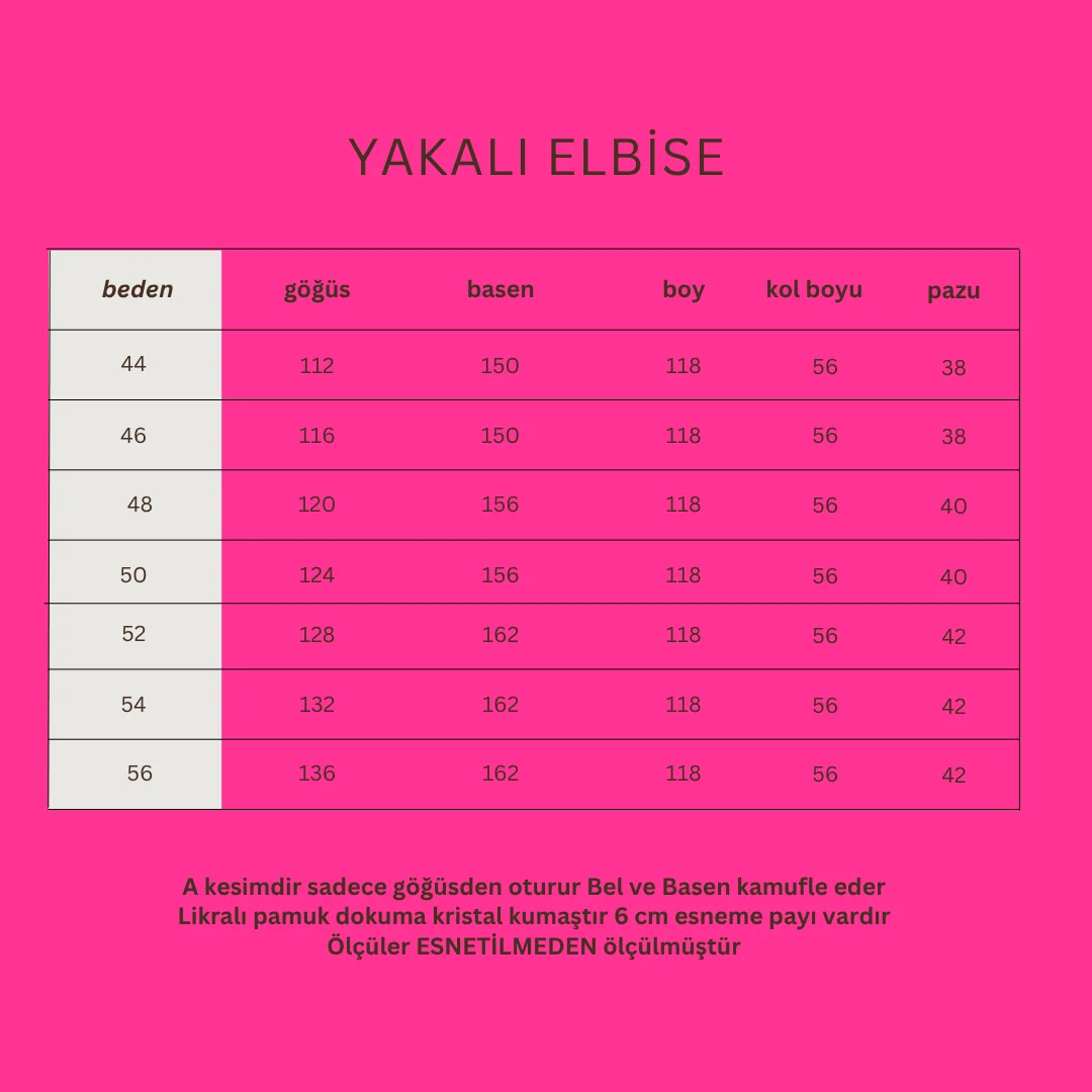Uzun kol detayları, mevsim geçişlerinde ideal bir koruma sağlarken, yakalı tasarım ise klasik bir şıklık katmaktadır. 44’ten 56 bedene kadar geniş bir beden aralığı sunarak, farklı vücut tiplerine hitap eder. Bu elbise, hem günlük kullanımda hem de özel davetlerde tercih edilebilecek çok yönlü bir seçenektir.